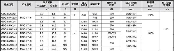 ***大載荷(t) | 罐籠質量(t) | 鋼繩終端質量(t) | 首繩 直徑(mm) | 尾繩 尺寸(mm) | 罐籠 總高(mm) | 鋼性罐道外形尺寸(mm) | 鋼繩罐道(mm) | 乘人數 | ||||||